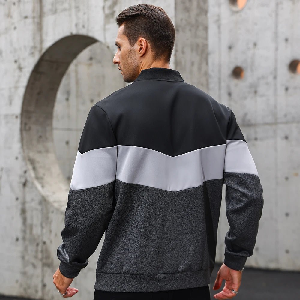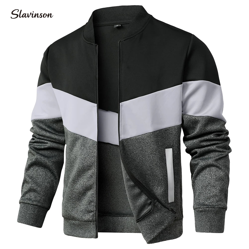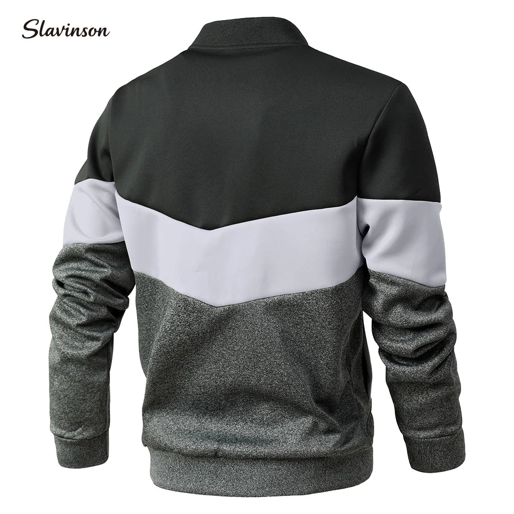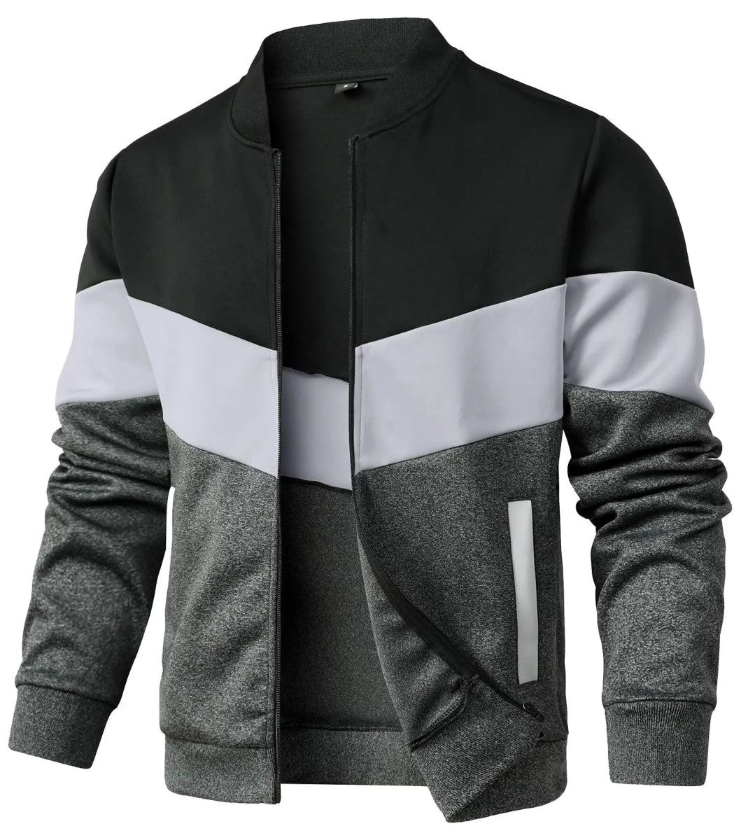 This men's bomber jacket features a bold color block pattern that adds a pop of color to any outfit. The contrasting panels of navy blue, grey, and black create a dynamic and eye-catching look that is sure to turn heads. Made from high-quality materials, this jacket is as durable as it is stylish, making it a must-have piece for any fashion-forward man.