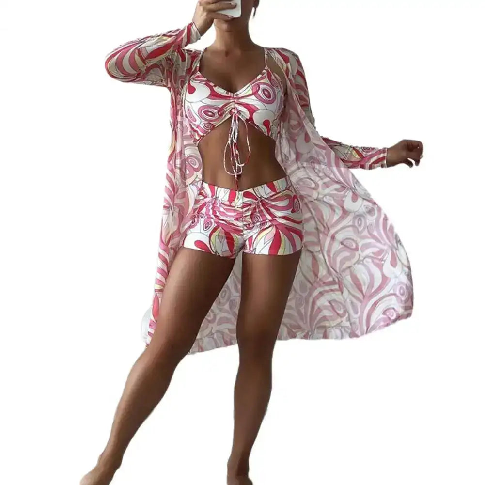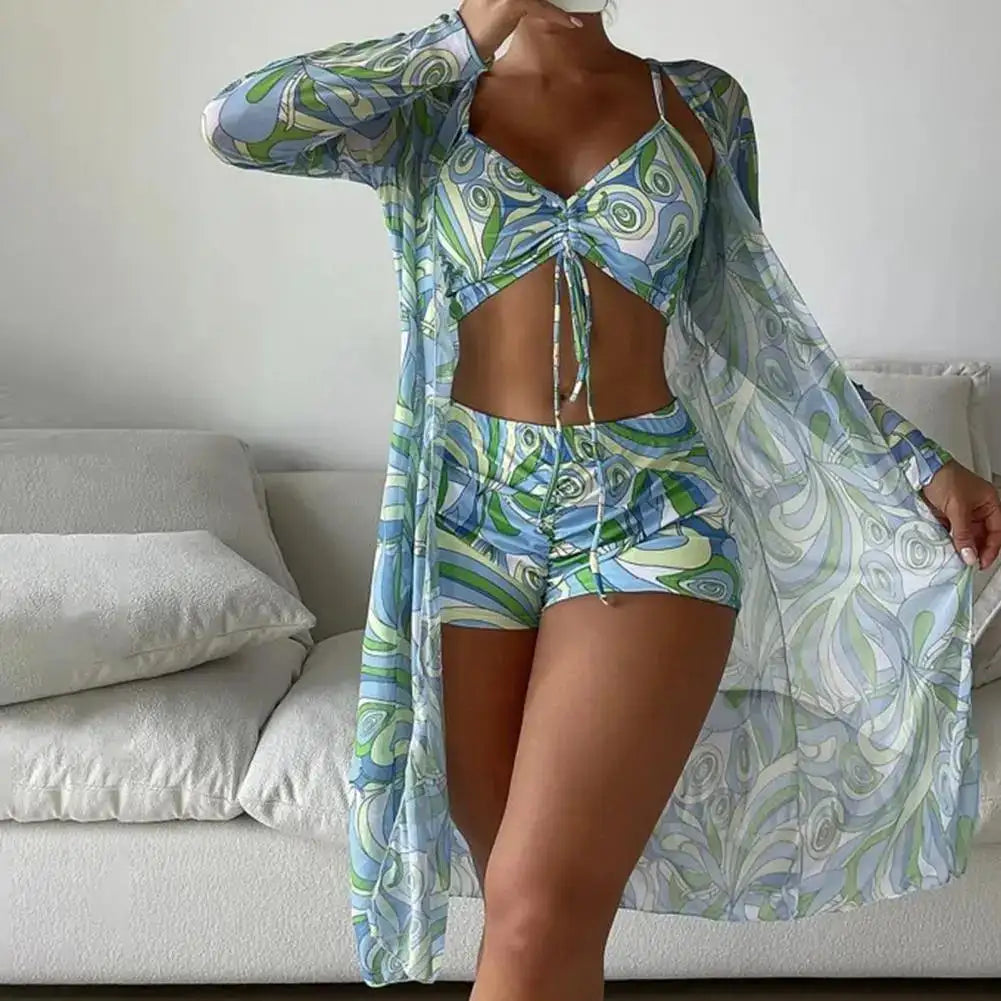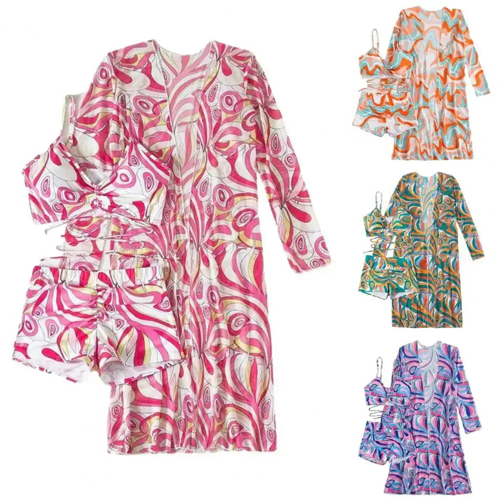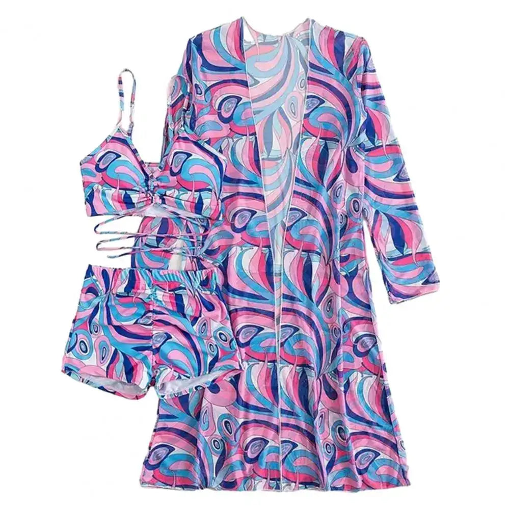 This chic 3-piece set is a beachwear essential, perfect for everything from beach vacations to surfing adventures. The bold floral print combined with refined detailing ensures that you are always the center of attention. A quintessential attire for those who love to make every summer moment unforgettable.