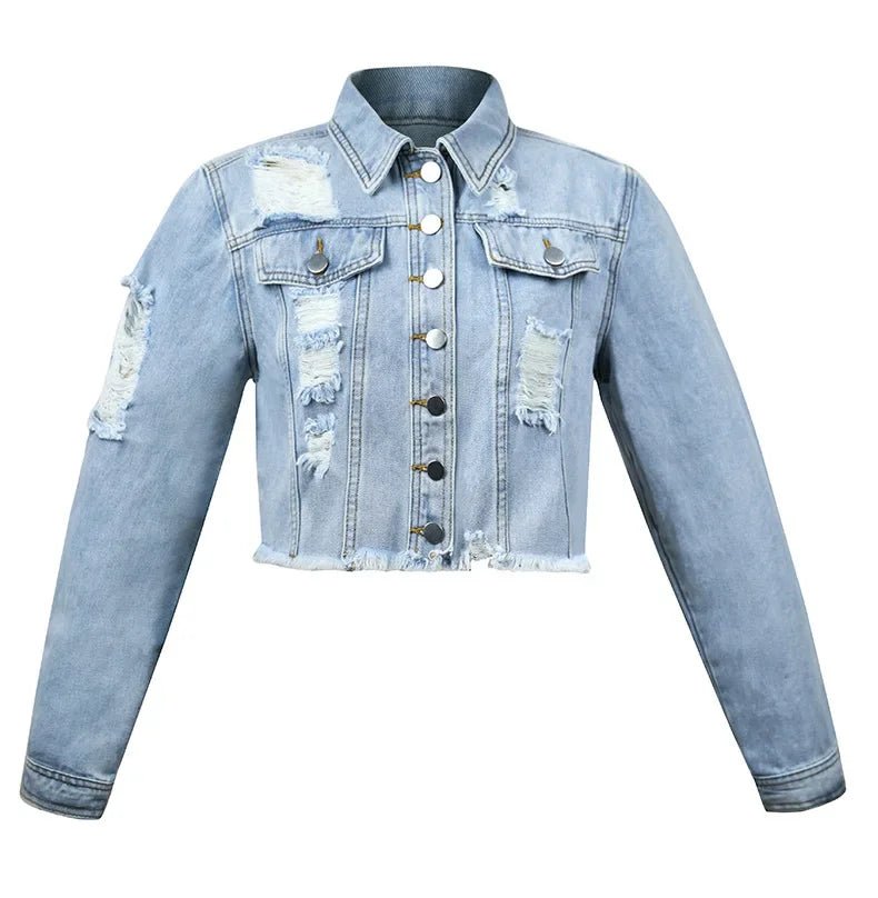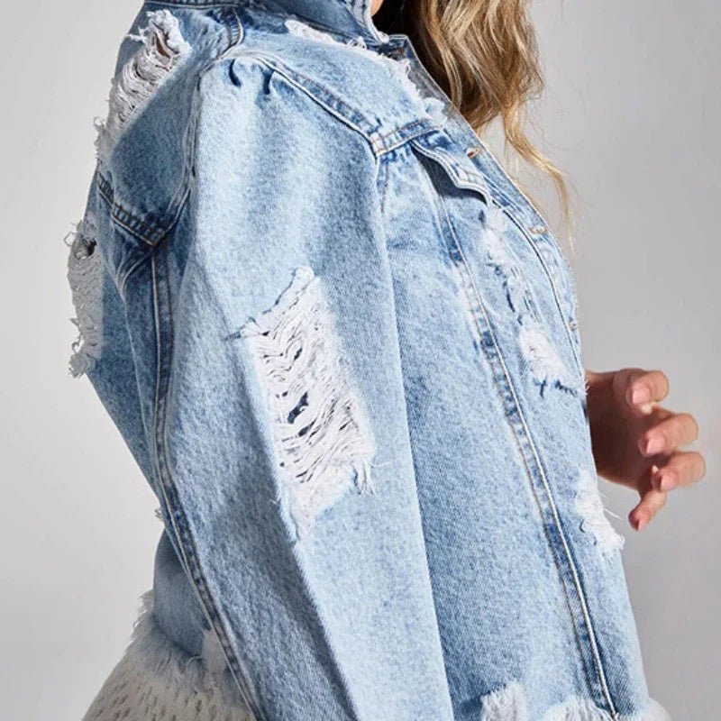 This women's distressed denim jacket is a must-have addition to your wardrobe. Whether you're running errands or hitting the town, this jacket will keep you looking stylish and on-trend. Add a touch of urban flair to your outfit with this chic and versatile piece.