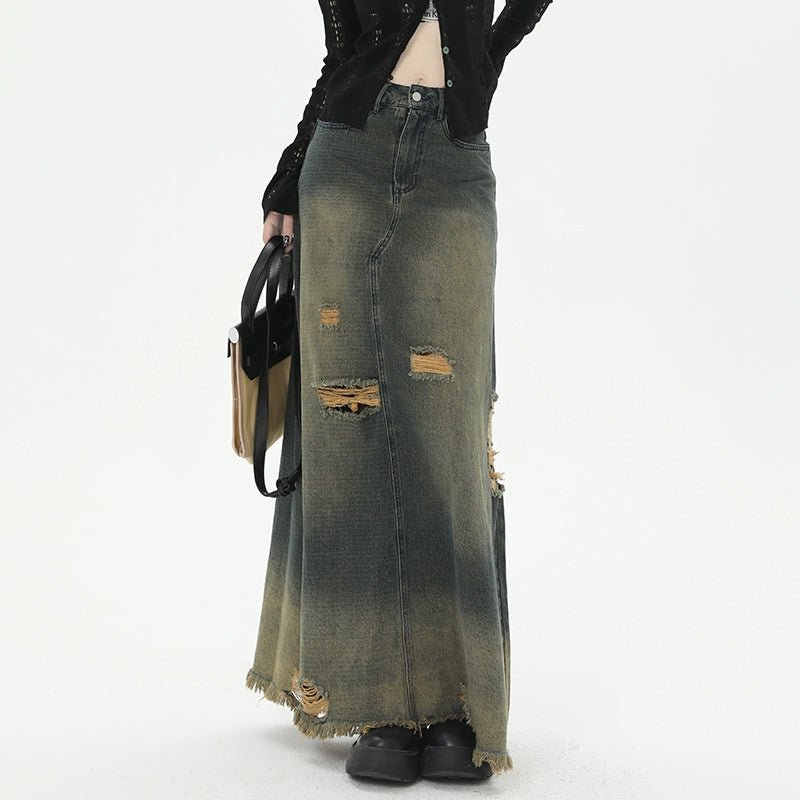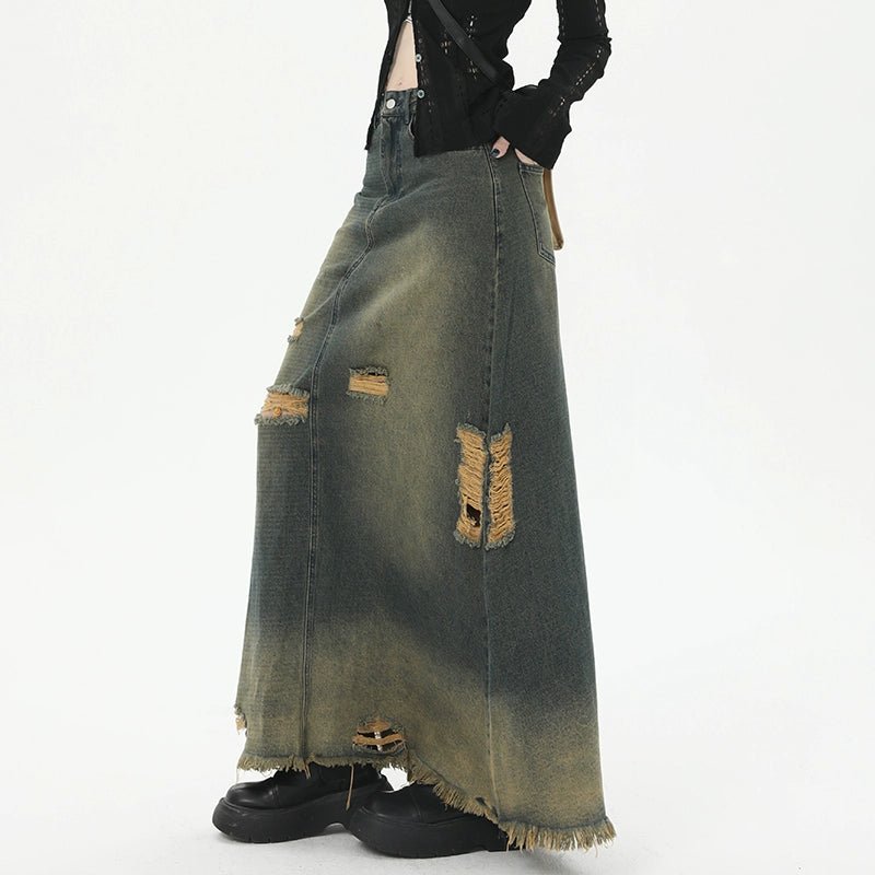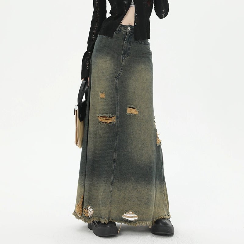 POWQUE URBAN STYLE Retro Tattered Denim Skirt Long - POWQUE URBAN STYLE